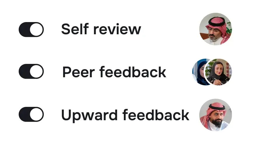 Ensure fairness in reviews with self, upward, and peer feedback.