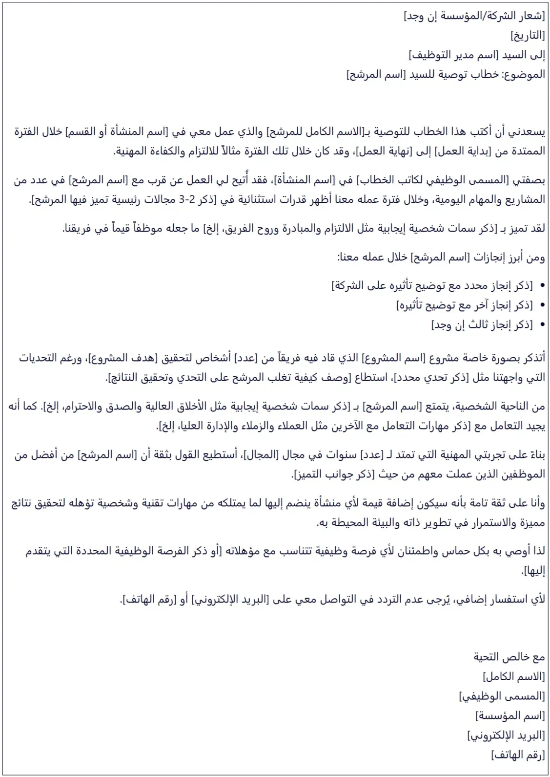 يجب أن يركّز الخطاب على المهارات ذات الصلة بالوظيفة المتقدم إليها، مع وصف دقيق للنتائج التي حققها المرشح، ويُفضل استخدام لغة مباشرة ومبنية على أفعال قوية تدعم كفاءة الموصى به.