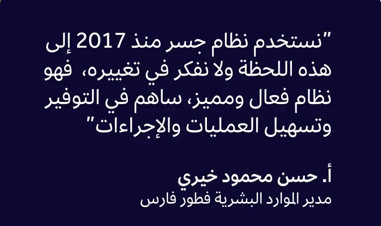 ساعد نظام جسر سلسلة مطاعم فطور فارس على تسهيل وتسريع جميع إجراءات إدارة الموارد البشرية من تسليم للرواتب في المواعيد الدقيقة وتوزيع لأوقات الدوام والمناوبات.